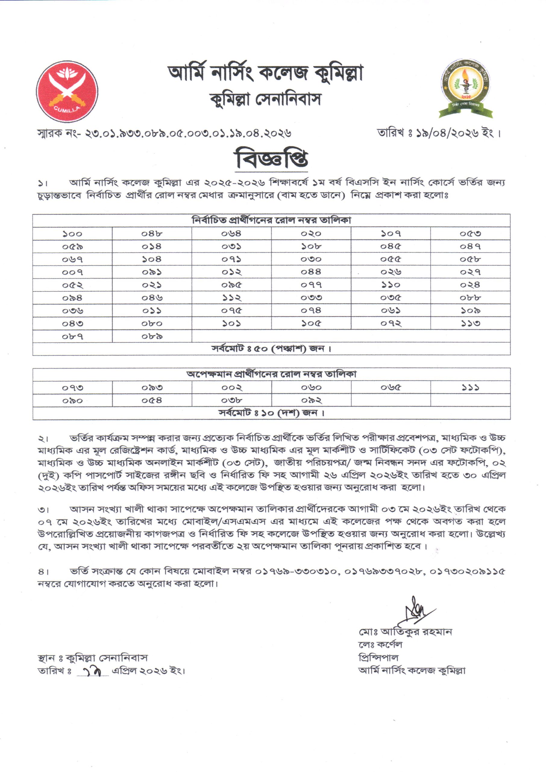 Army Nursing College Cumilla, Based on Army Administration